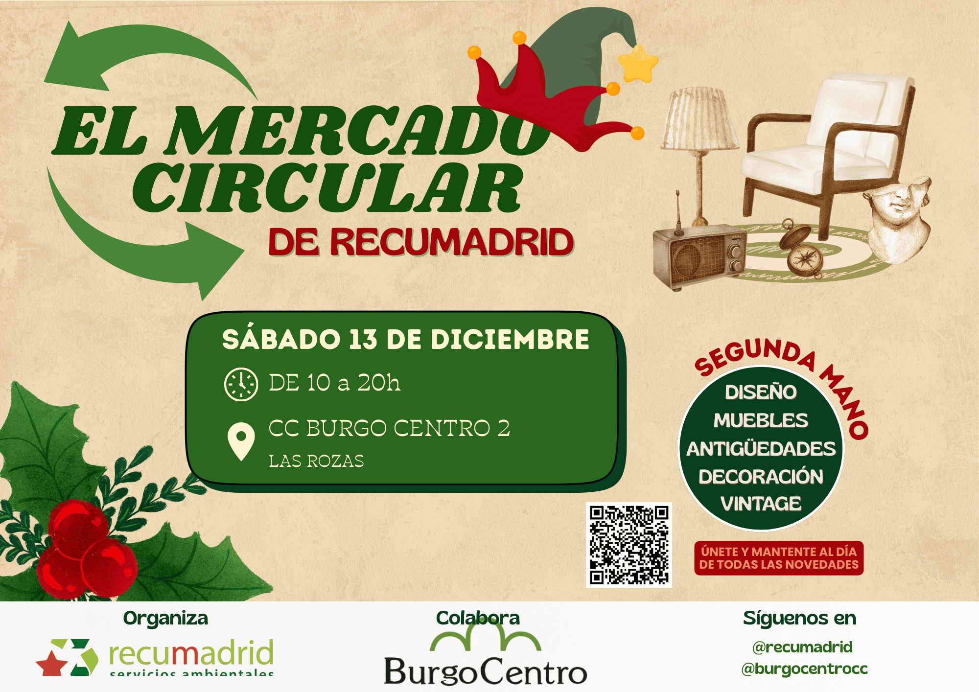 Ven y celebra el último mercado circular del año de Recumadrid, en colaboración con Burgo Centro, mientras disfrutas de una jornada diferente, apostando por el valor social y la economía circular.